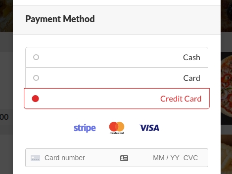 When Stripe is enabled, customers can choose from the online payment option when checking out. If a customer selects "Credit Card", the credit card field will drop-down below.